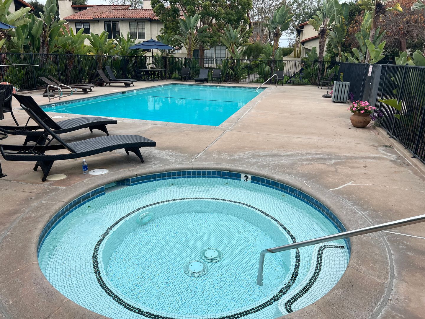 Spacious and bright 3 bedroom 2 bathroom end unit condo in a great location. This unit has all hardwood and tile flooring with the very nice kitchen and dining room and one bedroom and bathroom downstairs. Upstairs are two nice size bedrooms with one having a sliding door leading to a balcony overlooking a garden. Downstairs is a fully fenced patio that leads to the pool, jacuzzi and clubhouse and laundry room. There is a large garage below the unit with storage. MUS school district, walk to the beach. Tenant pays all utilities. $5500 a month rent. Call South Coast Realty for showings.