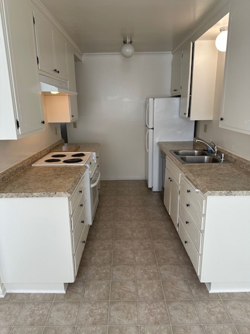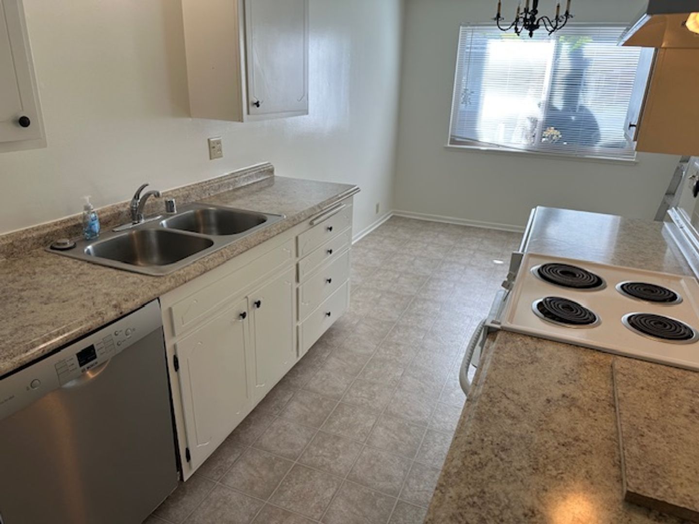 Unit has electric range and oven, gas heat , dishwasher and a full size refrigerator.