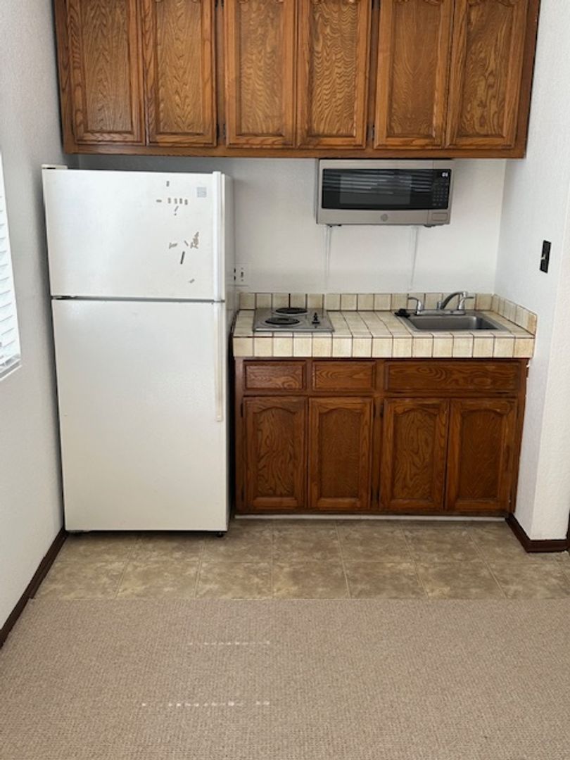 Clean and quiet studio available for rent. This unit is attached to the main house and features its own private entrance. It includes a refrigerator, two-burner stovetop, and microwave. Off-street parking and utilities are included. No pets.